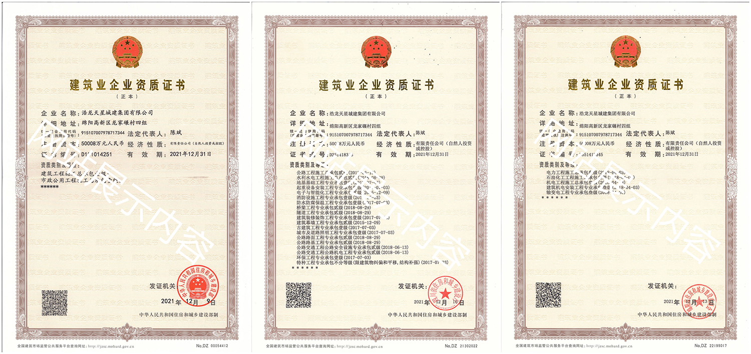 浩龍?zhí)煨浅墙瘓F有限公司,2007年成立于“李白故鄉、中國科技城”—四川省綿陽市,企業(yè)注冊資本金5.0008億元。公司共有27項建筑業(yè)企業(yè)資質,其中國家一級資質11項,二級資質10項,三級資質5項,特種資質不分等級1項,類別涵蓋建筑、市政、水利、機電、隧道、起重設備安裝等基礎及未來發(fā)展重點專業(yè)。公司下設三個辦事處,業(yè)務范圍輻射全國,在建項目三十余個,累計完成產值超11億元。公司是綿陽市建筑施工企業(yè)協會副會長單位、綿陽遂寧商會會長級單位、綿陽首批建筑業(yè)綠卡企業(yè),在綿陽本地企業(yè)中綜合實力名列前茅。